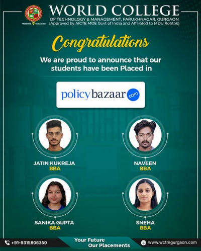 Congratulations to our BBA students Jatin Kukreja, Naveen, Sanika Gupta, and Sneha on securing placements at Policybazaar.com.