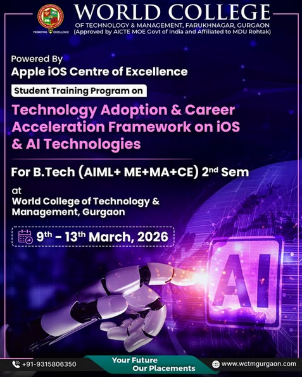 World College of Technology & Management, Gurugram, in collaboration with the Apple iOS Centre of Excellence, proudly presents a Student Training Program on Technology Adoption & Career Acceleration Framework on iOS & AI Technologies.
