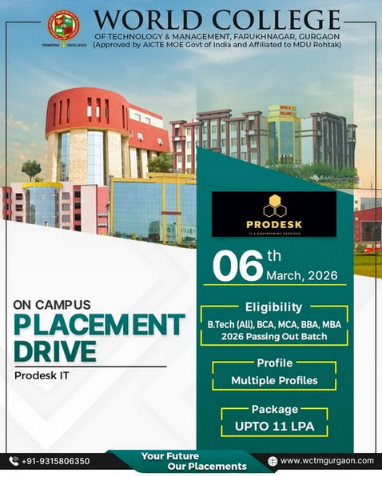 World College of Technology & Management, Farukhnagar is hosting an On-Campus Placement Drive with Prodesk IT & Engineering Services for the 2026 passing out batch.