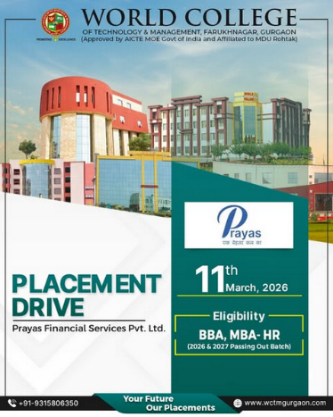 World College of Technology & Management successfully organized an On-Campus Placement Drive in collaboration with Prayas Financial Services Pvt. Ltd.