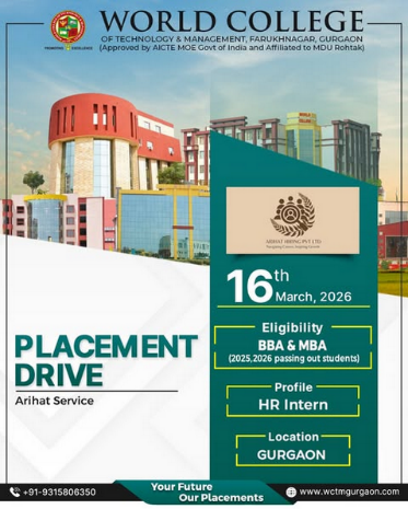 The Training & Placement Department of World College of Technology and Management (WCTM), Gurgaon is pleased to organize a Placement Drive by Arihat Hiring Pvt. Ltd. for our students.